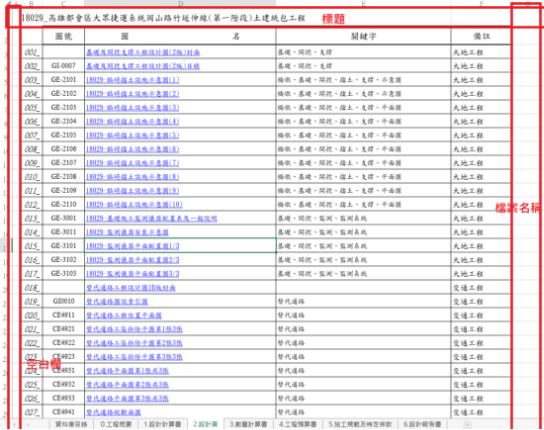 1) 工作表目前分為三類,目錄(不進行匯入)、一般檔案(非設計圖及成果圖)、設計圖及成果圖,請遵照提供的範本excel填寫。 1) 每個工作表中不能留下空白的行列。 1) 儲存格中不能有標題。 1) 請新增檔案名稱欄位至除了目錄外的工作表中,並使用提供的巨集工具。(參見:設計資料庫Excel巨集操作手冊(ver2.0).pdf) 1) 其餘注意事項請至範本excel中的注意事項參照。